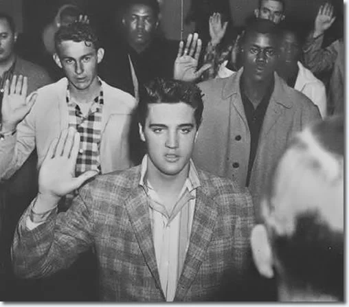 In this image from March, 1958, Elvis Presley is seen being sworn-in for military duty at Fort Chaffee, Arkansas.