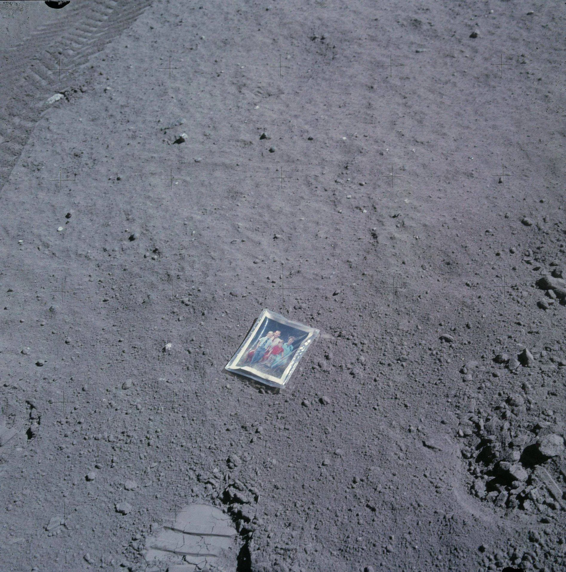 During the Apollo 16 mission, Lunar Module pilot Charles Duke was collecting samples of soil and rock from the surface of the moon. Although he gathered many pounds of lunar material from different areas of the landing site, he also left something behind. Above his boot-print (visible at bottom), Duke also left a family portrait wrapped in plastic, showing him, his wife and their two sons sitting on a bench.