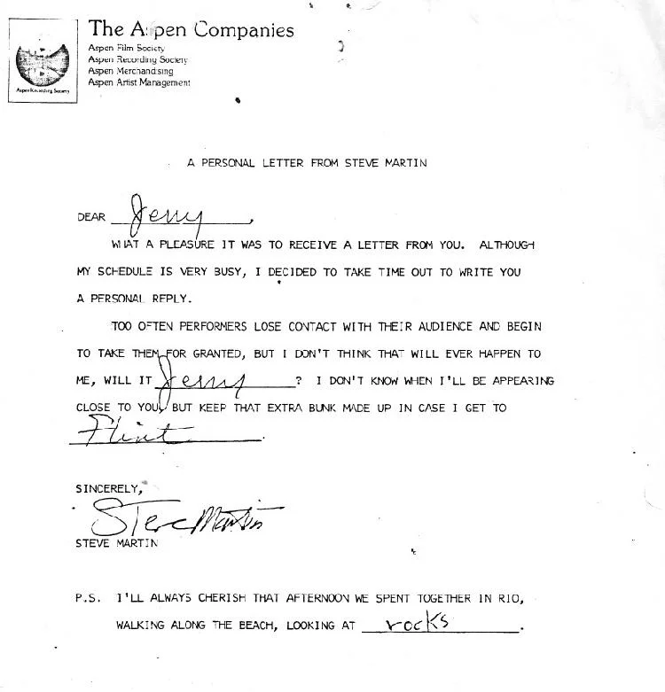 A painstakingly personalized letter from the 1980s, featuring comedian and actor Steve Martin delivering a response to a fan who had written him repeatedly.