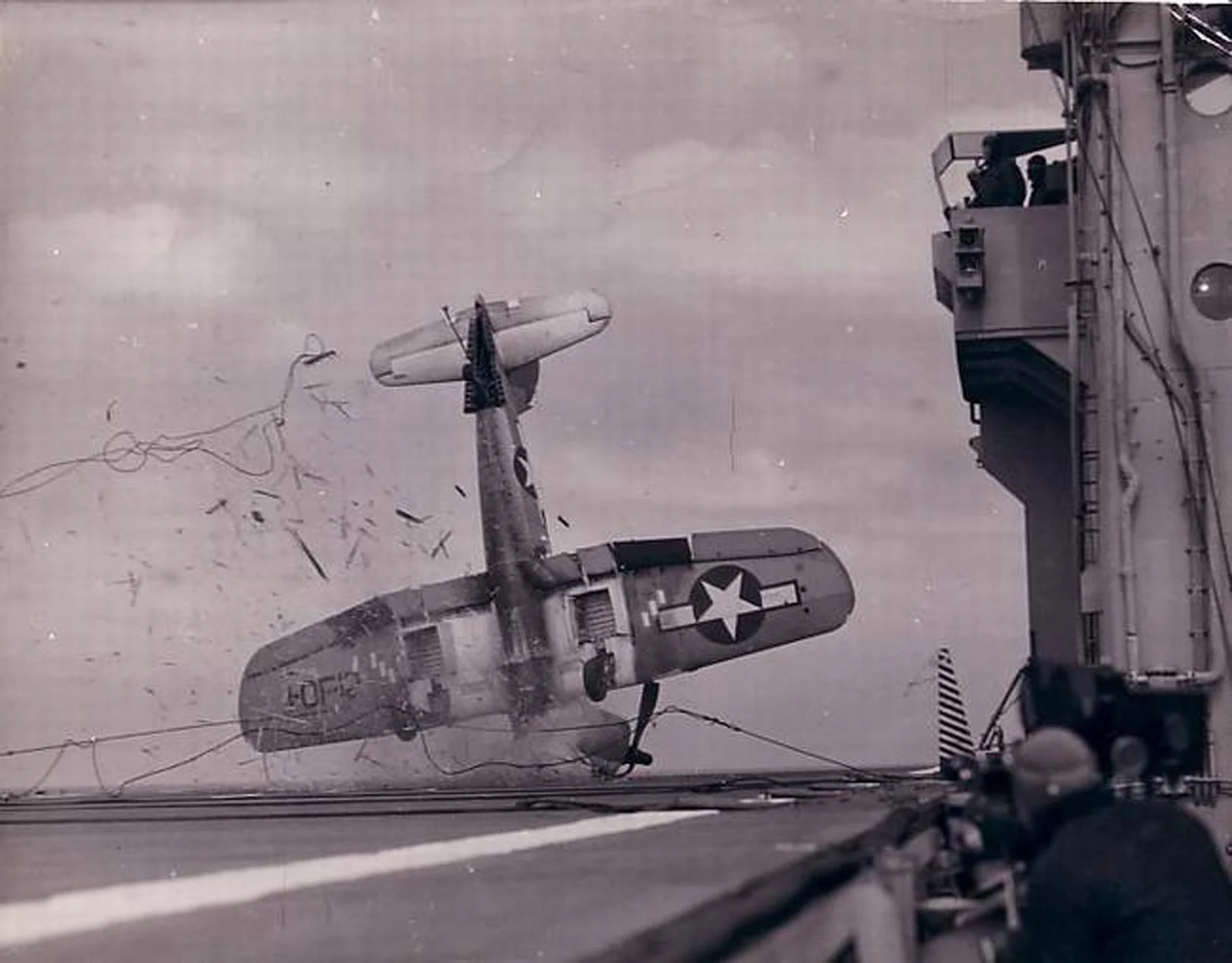 A Vought F4U Corsair crashes on the deck of an aircraft carrier due to an arresting gear failure.
