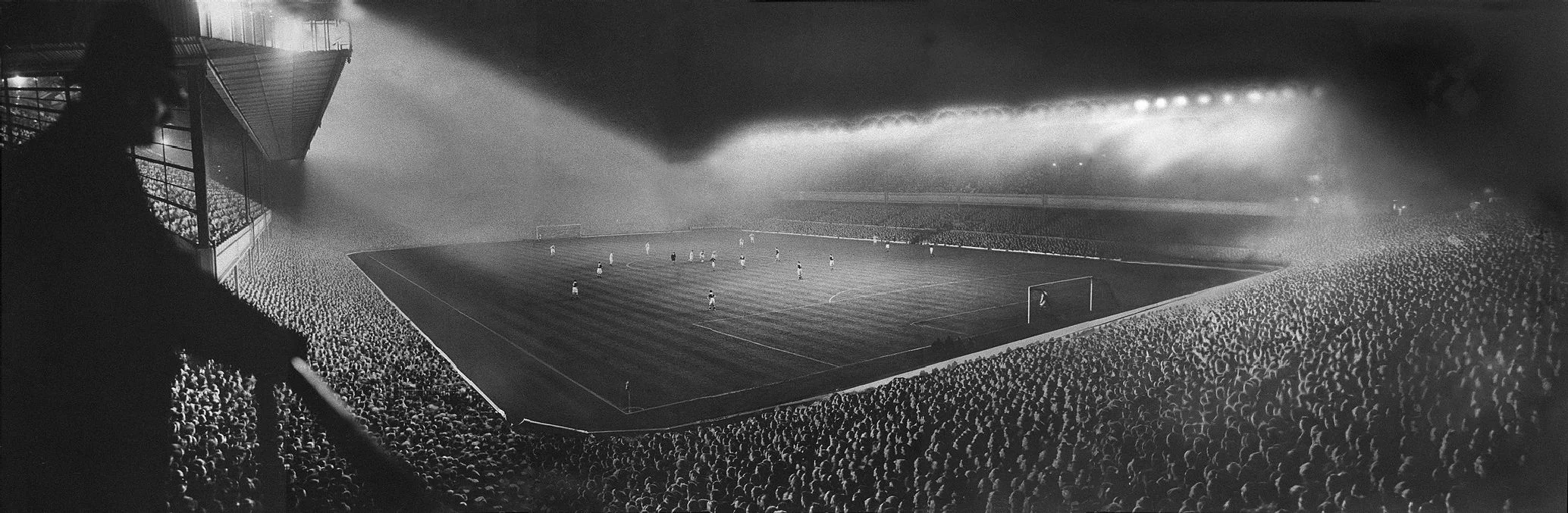 This striking photograph is captured as 62,000 fans fill the Arsenal Football Stadium in Highbury, North London to see Arsenal challenge the Glasgow Rangers. It is Arsenal's second match ever to be played under Highbury's floodlights (the first during a September 19 match against Hapoel Tel Aviv). Under these powerful new lamps Arsenal would claim a 3-2 victory over Glasgow; conquest and stadium both immortalized in wide-format monochrome.